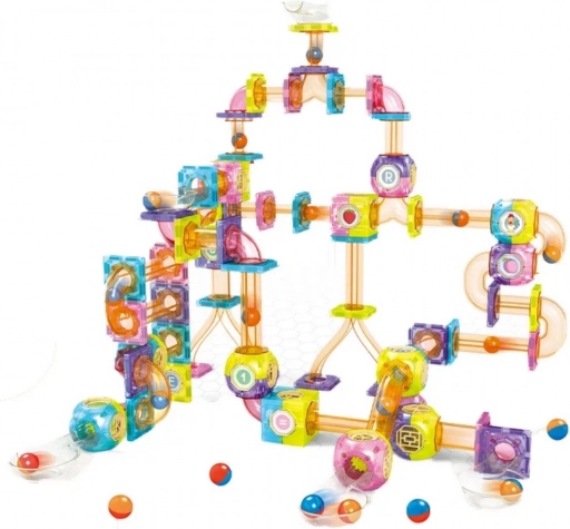 Táto pestrá magnetická guľôčková dráha ponúka nekonečné možnosti stavania. Priehľadné diely v dúhových farbách motivujú deti k experimentovaniu, zatiaľ čo magnety držia konštrukcie pevne pohromade. Súčasťou sú trubice, krivky, spojky aj misky, ktoré vytvárajú plynulý prejazd guľôčok.