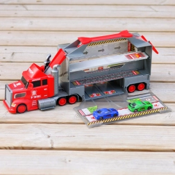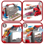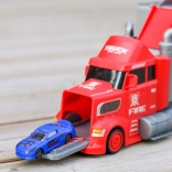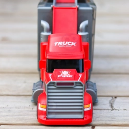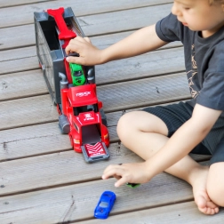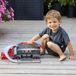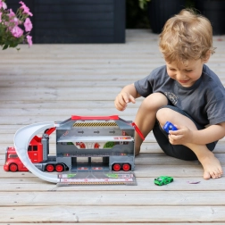 Toto multifunkčné nákladné auto v atraktívnom hasičskom dizajne slúži ako prepravný ťahač a po rozložení sa zmení na kompletný herný set s garážou, parkovacími miestami a dynamickou traťou. Vďaka vystreľovaču áut deti odštartujú preteky v priebehu sekundy.