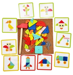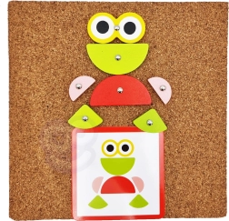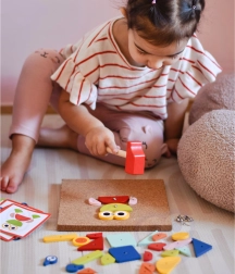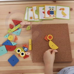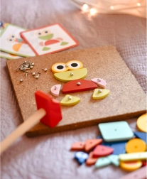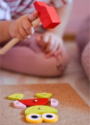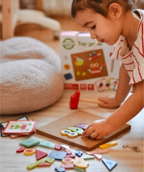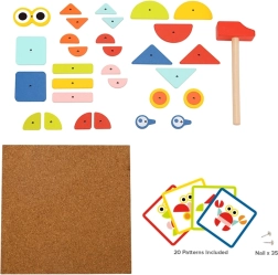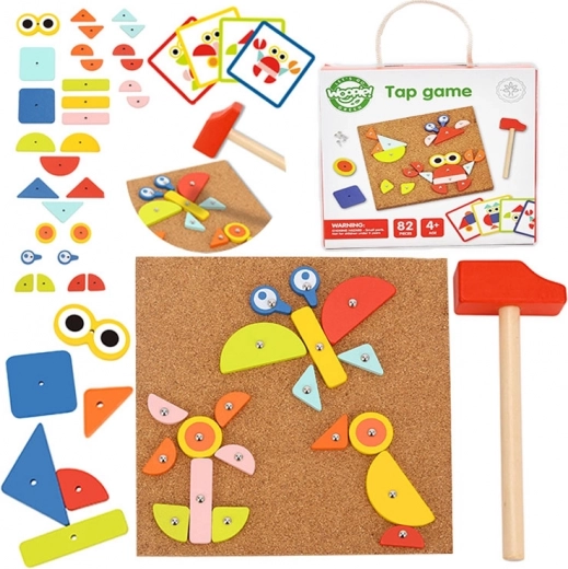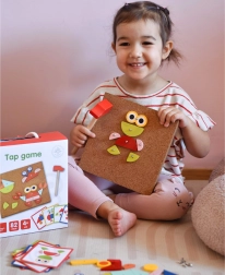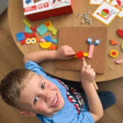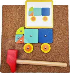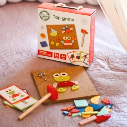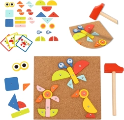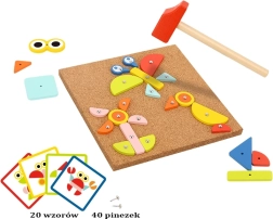 WOOPIE Green pribíjacia hračka je skvelý spôsob, ako podporiť kreativitu a logické myslenie detí. Sada sa skladá z 30 drevených kociek, 10 obojstranných kariet s 20 vzormi na troch úrovniach obtiažnosti, 40 pripínačiek, tabule a kladivka. Deti sa snažia verne reprodukovať obraz z karty pomocou kociek rôznych tvarov a farieb, alebo môžu vytvárať vlastné návrhy podľa vlastnej fantázie a kreativity.