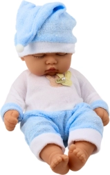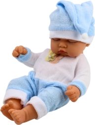 Bábika má kompaktné rozmery približne 24 x 12 cm, takže je ideálna pre detské ruky. Pyžamko je z mäkkého materiálu v krásnej modrej farbe, doplnené roztomilou čiapkou s brmbolcom. Malá potlač na tričku s motívom cumlíka dodáva bábike jemný, detský pôvab.