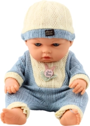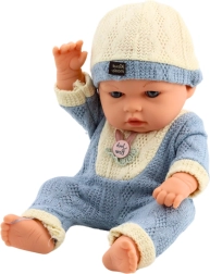 Bábika má rozmery približne 29 x 15 cm, čo ju robí dostatočne veľkou na to, aby zanechala dojem, ale zároveň ľahkou a jednoducho ovládateľnou – ideálne sa drží v malých rukách a jednoducho sa zmestí do väčšiny detských kočíkov či postieľok. Je oblečená do mäkkého pleteného kompletu v odtieňoch svetlého krému a pastelovej modrej, ktorý je ozvláštnený nášivkou.