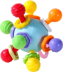 Vstavaná hrkálka jemne znie pri pohybe, čo podporuje rozvoj sluchu a upútava pozornosť dieťaťa. Kompaktná veľkosť a úchyty prispôsobené pre malé ruky umožňujú ľahké uchopenie, otáčanie a stisk, čím sa trénuje koordinácia a sila úchopu.