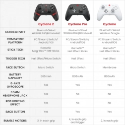 Zažite presné ovládanie a špičkový výkon s ovládačom GameSir Cyclone 2. Ponúka trojrežimové pripojenie (2,4 GHz, Bluetooth, kábel), páčky Mag-Res TMR, analógové spúšte s Hallovým efektom, 6-osový gyroskop, pohlcujúce vibrácie a RGB podsvietenie pre konzoly SWITCH, PC, Android a iOS.