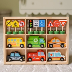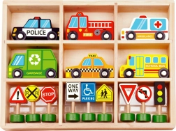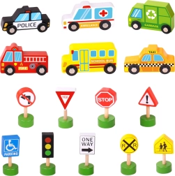 - Obsah sady: sanitka, hasičské auto, taxi, školský autobus, policajné auto, smetiarske auto, semafor a 8 dopravných značiek.
