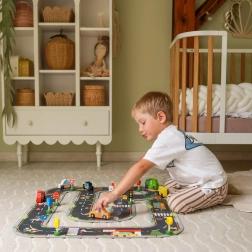 Stavanie scén, presúvanie autíčok a práca so značkami rozvíjajú jemnú motoriku, kreativitu aj sociálne zručnosti pri spoločnej hre.