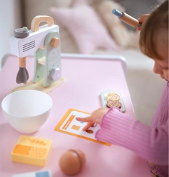 Objavte čaro pečenia s dreveným mixérom v jemných pastelových farbách, ktorý deťom umožní napodobňovať svet dospelých. Od otáčania gombíkom po miešanie v mise – realistické detaily a bezpečné zaoblené prvky z kvalitného dreva z neho robia ideálny doplnok do každej detskej kuchynky.
