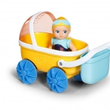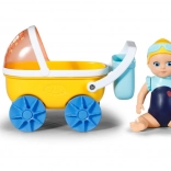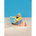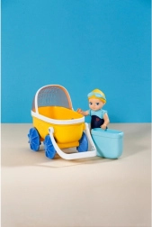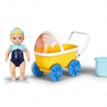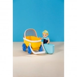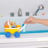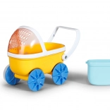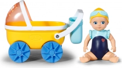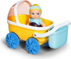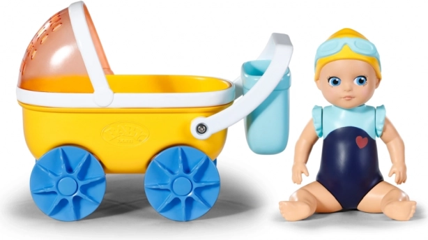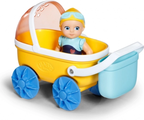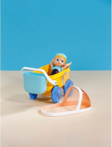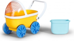 - Žltý kočík, modré kolesá a košík, bábika v modrých plavkách