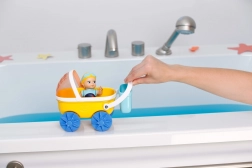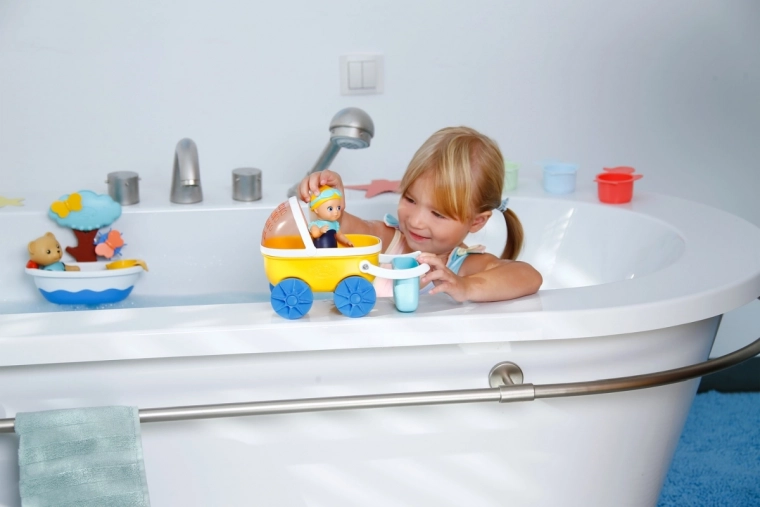 Veselý kočík BABY born Splish Splash s bábikou Emma premení každý večerný rituál na zábavnú vodnú hru. Deti môžu kočík tlačiť po okraji vane, pripevniť ho pomocou prísaviek a objavovať vodné efekty so slnečnou clonou–sitkom. Emma je pripravená na plávanie: stačí natočiť jej ruky dozadu a pustiť – sama sa rozpláva.