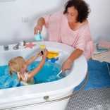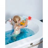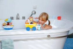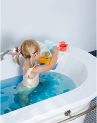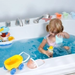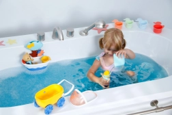 Odolná plastová konštrukcia, oblé tvary a jasné farby podporujú zmyslové vnímanie aj jemnú motoriku. Set je ideálny na kúpeľ, bazénik aj hru pri umývadle a vďaka odnímateľnému košíku sa ľahko čistí a variabilne používa.