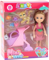 Mini bábika v sete má dlhé blond vlasy spletené do vrkôčikov, oblečená v ružových pruhovaných šatách a ružových topánkach. Sada obsahuje ružovo-fialový kočík určený na prevoz dvoch rozkošných mačiatok – bieleho a hnedého. Set je doplnený zvieracími doplnkami, ako sú klobúk, čiapka a dve korunky, čo umožňuje dieťaťu vytvárať rôzne scény a rozvíjať ich predstavivosť.