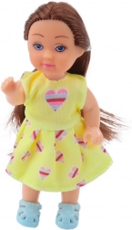 - Bábika s hnedými vlasmi v žltých šatách s srdiečkami
