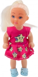 - Bábika so svetlými blond vlasmi v tmavoružových šatách s hviezdami