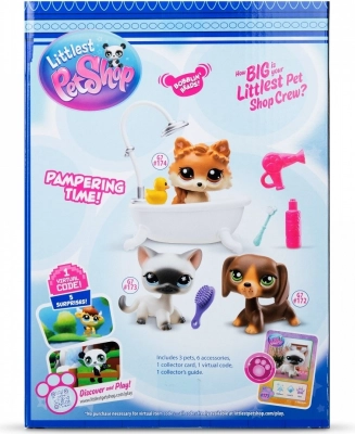 Doprajte svojim maznáčikom luxusnú starostlivosť so setom Littlest Pet Shop SPA! Obsahuje 3 rozkošné figúrky (jazvečík, siamská mačka, pomeranian) a farebné spa doplnky na hranie a kreatívne príbehy. Nechýba zberateľská kartička a virtuálny kód na odomknutie digitálnych prekvapení vo svete LITTLES PET SHOP.