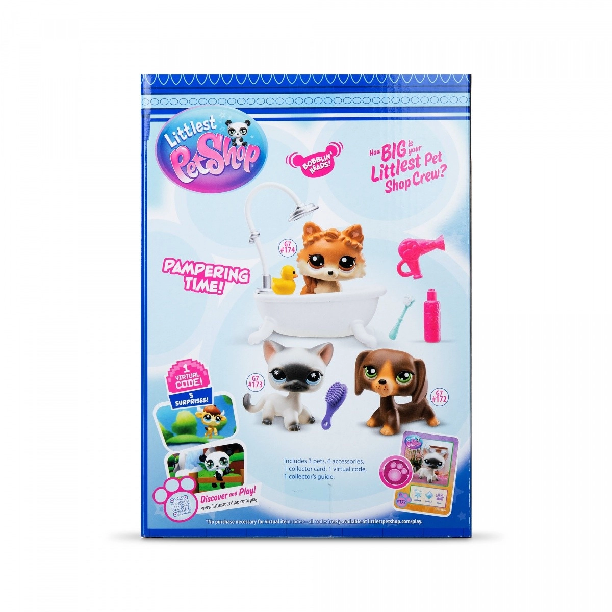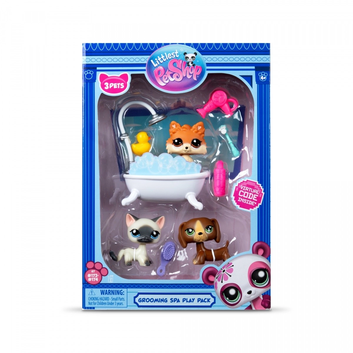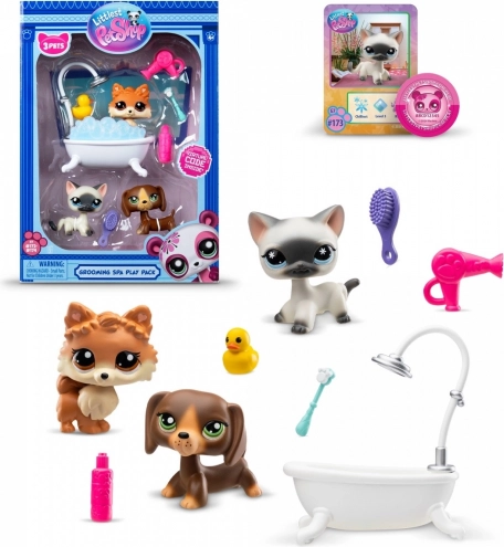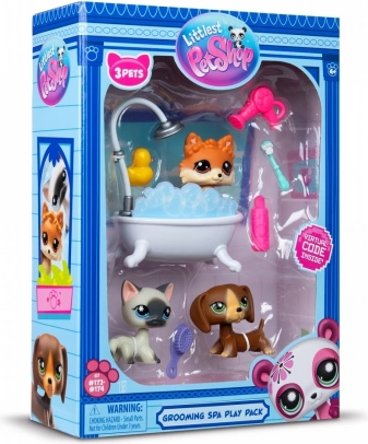 Littlest Pet Shop SPA set G7 S3: 3 figúrky, 10 doplnkov, zberateľská karta a virtuálny kód. Zábava pre zberateľov aj deti, starostlivosť o maznáčikov a online bonusy.