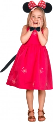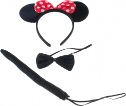 Táto kompletná kostýmová sada myšky je ideálna na karneval, Halloween, školské besiedky aj domáce hranie. K ikonickým ušiam s červenou bodkovanou mašľou ladí čierny motýlik a chvostík, takže prevlek je hotový behom pár sekúnd.