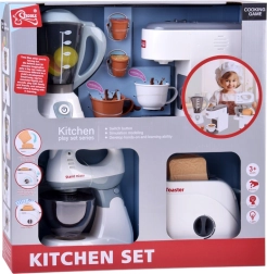 Objavte kompletnú sadu detských kuchynských spotrebičov v elegantnej bielej farbe, ktorá deťom umožní napodobňovať dospelých a rozvíjať kreativitu aj sociálne zručnosti. Set obsahuje mixér, kávovar, hriankovač a stolný mixér s realistickými svetelnými a zvukovými efektmi, funkciou vyskočenia hrianky a možnosťou nalievania skutočnej vody do šálok. Ideálny doplnok pre každú detskú kuchynku.