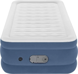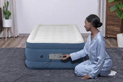 Vyššia konštrukcia (46 cm) uľahčuje vstávanie a ukladanie, zatiaľ čo bočný rám zaisťuje ochranu proti skĺznutiu počas spánku. Integrovaný port USB a elektrická pumpička (220-240V) poskytujú moderné riešenie pre každodenné použitie. Vyrobené z odolného materiálu PVC pre dlhšiu životnosť.