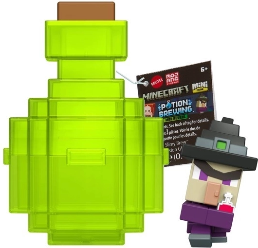 Udalosti v kolekcii Minecraft Mini Mode Potion Brewing sú plné vzrušenia a prekvapení. Otvorte každý nádherný elixírový kontajner a objavíte mini figúrku a balíček častíc Slimy Brew Potion. Pridajte ich do kontajnera spolu s vodou (nie je súčasťou) a poriadne pretrepte, aby ste odhalili kúzlo elixíru. Farba a vzhľad vašej figúrky sa transformujú vďaka mechanizmu Color Reveal, čo prinesie nový vzhľad.