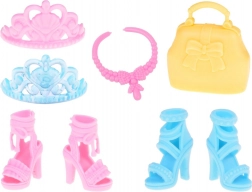 Dva elegantné páry topánok na vysokom opätku pridávajú celkovému vzhľadu na šarme a štýle. Doplnky, ako je efektívna kabelka, ružový náhrdelník a dve korunky sú perfektné pre každú malú princeznú.