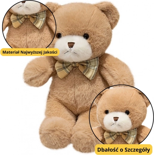 Plyšový medveď je oblečený do elegantného károvaného motýlika, ktorý mu dodáva výnimočný šarm. Vďaka stabilnej konštrukcii a proporčnej siluete môže medveď sedieť sám, čo ho robí skvelým dekoratívnym prvkom do detskej izby. Je to ideálny priateľ na denné hry a perfektný darček pre každého, kto ocení klasické, roztomilé plyšové hračky.