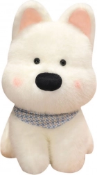 Plyšový psík sa vyznačuje jemne bielou srsťou a čiernymi očami, ktoré mu dodávajú obzvlášť roztomilý vzhľad. Celkový dizajn je obohatený o ozdobnú šatku v modrých tónoch, ktorá podtrhuje jeho priateľský charakter.