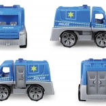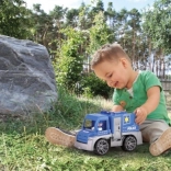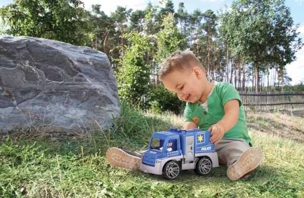 Robustné policajné auto z kvalitného plastu pre deti od 2 rokov. Ponúka mechanické funkcie bez batérií, otváracie dvere, vyklápateľnú kabínu a figúrku policajta so štítom pre kreatívnu hru doma aj v piesku.