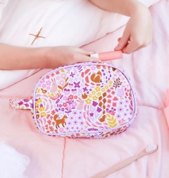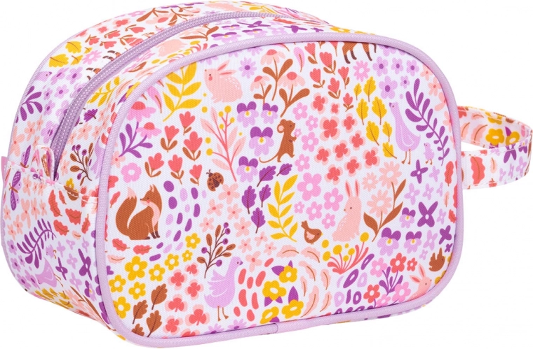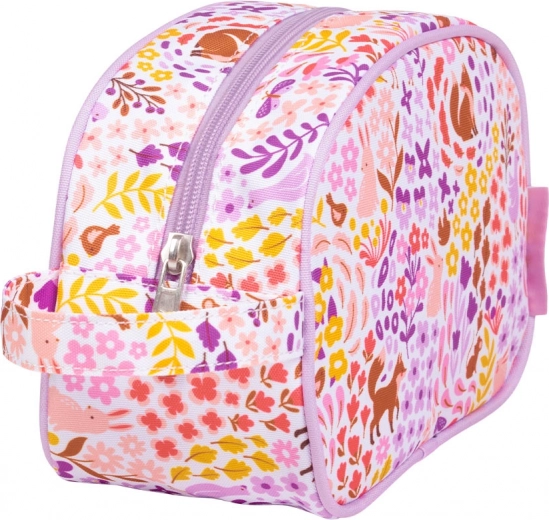Vychutnajte si praktickú svetlofialovú toaletnú taštičku s jedinečnou zvieracou potlačou v kvetinovej záhradke.