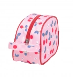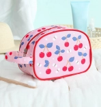 Štýlová ružová toaletná taštička s motívom čerešní, ideálna na výlety, letné tábory alebo dovolenku.