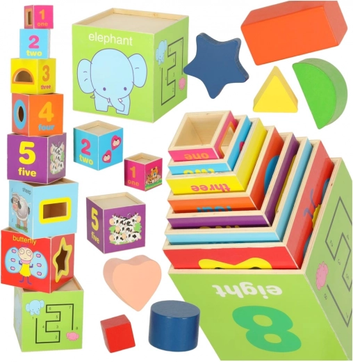 Tento set obsahuje 8 farebných drevených kociek, ktoré možno skladať na seba a vytvárať vežu vysokú až 71 cm! Každá kocka má 8 aktívnych vzdelávacích strán, ponúkajúcich rôzne možnosti hry a učenia.