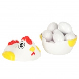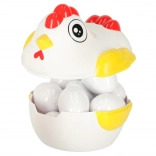 Zábavná Kura s prekvapením! Táto edukatívna hračka ponúka 12 vajíčok, ktoré treba zložiť podľa tvarov. Každé vajce skrýva kúsok, ktorý pasuje iba do správnej polovice.