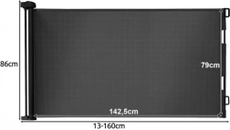 Praktická výsuvná bezpečnostná bránka so sieťovinou chráni deti aj domáce zvieratá pred nebezpečnými zónami v domácnosti. Ľahko sa ovláda, šetrí miesto a vďaka čiernemu prevedeniu zapadne do každého interiéru. Rozťahovacia až na 160 cm, výška 86 cm, odolná PVC sieť a pevné kovové a plastové komponenty zabezpečujú spoľahlivú zábranu pri dverách, v chodbách aj pri schodiskách.