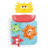 Základňa s reliéfom vĺn a silnými prísavkami drží na hladkom povrchu vane či obkladu, takže sa deti môžu hrať bezpečne bez posúvania.