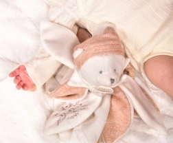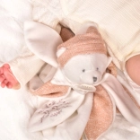 Tento plyšový medvedík je vyrobený z hebkej ružovej tvidovej tkaniny a zdobený jemnou výšivkou. Veľké okvetné lístky na telíčku pomáhajú rozvíjať jemnú motoriku dieťaťa a zároveň poskytujú pocit pohodlia a bezpečia.