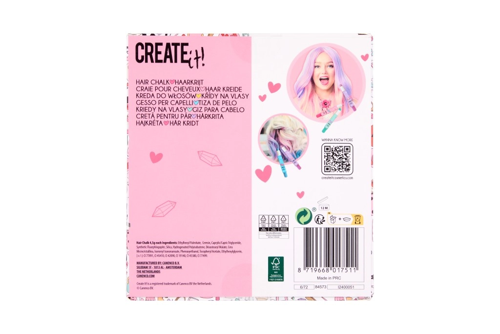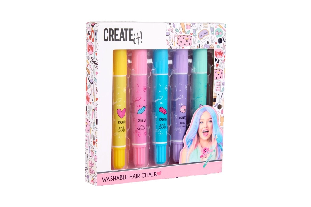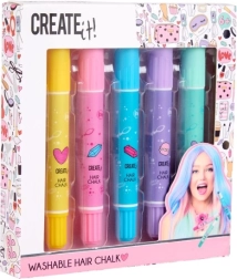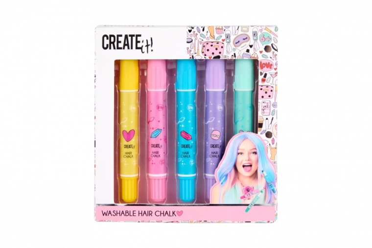 Objavte kreatívne možnosti s kriedami na vlasy v ceruzke od Creat it! Balenie obsahuje 5 rôznych farieb pre efektné a jednoduché farbenie vlasov.
