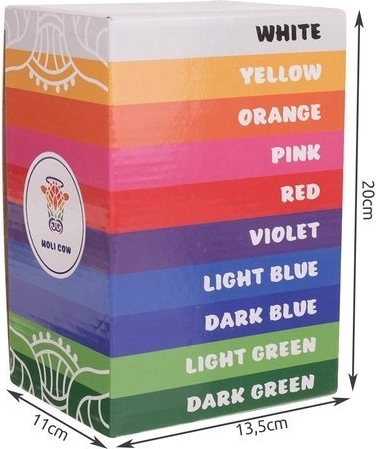 Zažite atmosféru farebných festivalov s kompletnou sadou 10 výrazných odtieňov. Farebný prášok HOLI je vyrobený zo škrobu z kukurice s kvalitnými farbivami, vďaka čomu je ľahký, krásne poletuje a vytvára fotogenické efekty pri hádzaní do vzduchu aj na skupinových akciách.