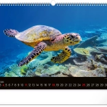 Úvodná stránka kalendára vás zavedie pod hladinu k nádhernej morskej korytnačke preplávajúcej cez koralové útesy. Táto fotografia je dôkazom dokonalosti oceánskeho sveta.