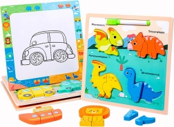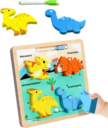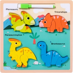 Táto drevená vzdelávacia skladačka s motívom dinosaurov ponúka unikátnu kombináciu zábavy a učenia. Na farebnej doske nájdete štyroch rozkošných dinosaurov - Pterosaur, Triceratops, Parasaurolophus a Brontosaurus. Každý z týchto dinosaurov sa skladá z niekoľkých častí, ktoré dieťa umiestňuje na správne miesto, čo mu pomáha učiť sa rozpoznávať tvary, farby a názvy prehistorických tvorov.