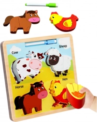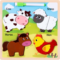 Táto drevená edukačná skladačka obsahuje zvieratká ako krava, ovca, kôň a sliepka, ktoré sú známe deťom. Každé zvieratko sa skladá z niekoľkých dielov, ktoré je nutné umiestniť na správne miesto, čo podporuje rozvoj koordinácie pohybov a logického myslenia.