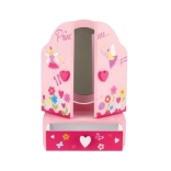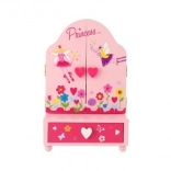 Drevená toaletka so šperkovnicou Princess je skvelým doplnkom do detskej izby. Stredové oválne zrkadlo dopĺňajú dve postranné krídla pre pohodlné nastavenie uhla. V spodnej časti nájdete praktickú zásuvku, kam si deti uložia svoje malé poklady. Jemné zdobenie s motívmi víl, kvetín a srdiečok podporuje fantáziu a radosť z hry.