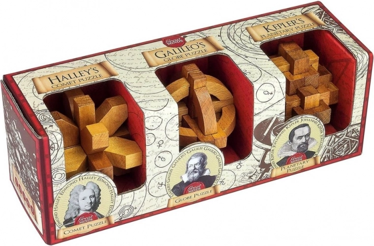 Táto elegantná kolekcia kombinuje kvalitné drevené spracovanie s chytrým dizajnom, ktorý odkazuje na priekopníkov astronómie. Každý hlavolam je výzvou na rozobratie a opätovné zloženie, a zároveň pútavým odkazom na HALLEYHO, GALILEA a KEPLERA.