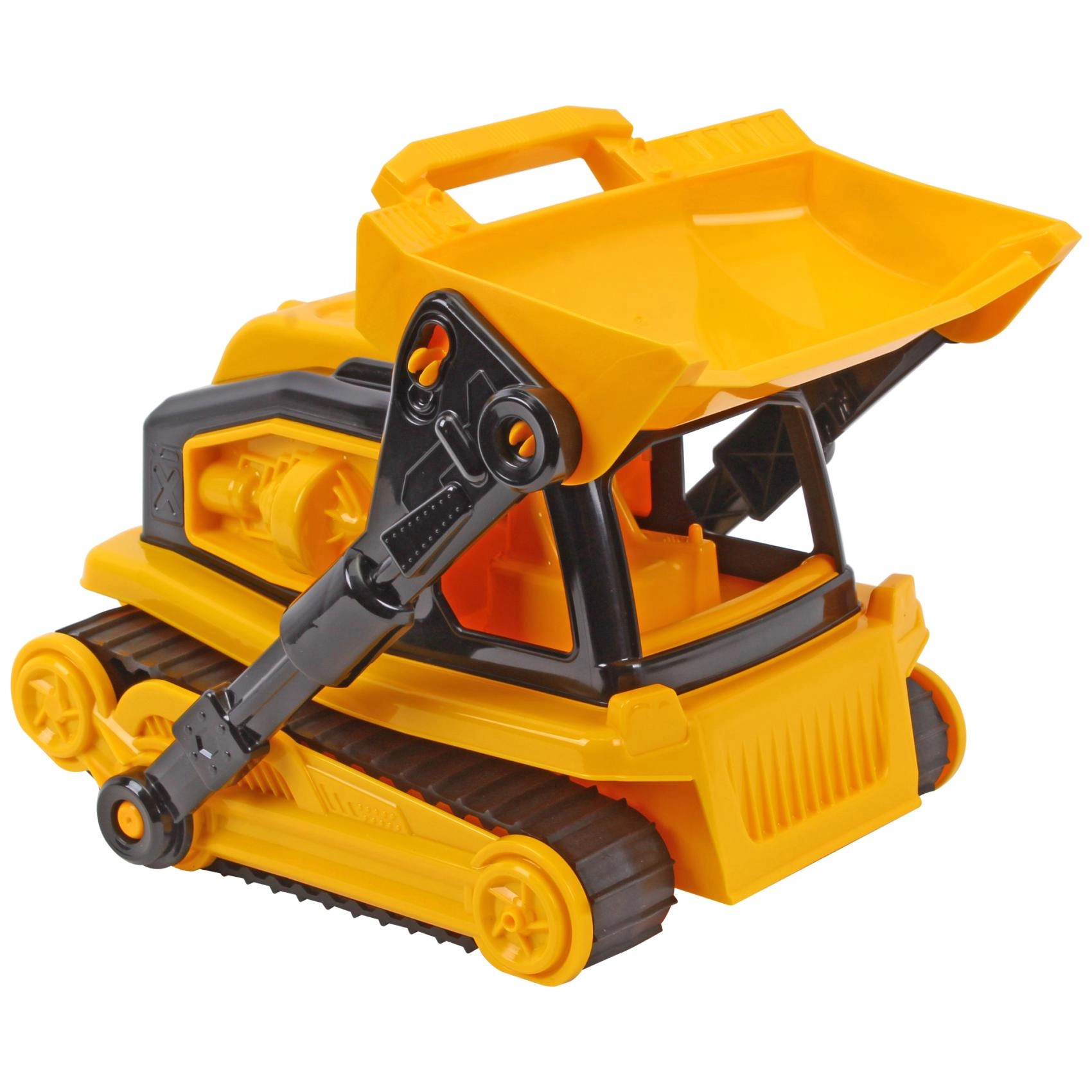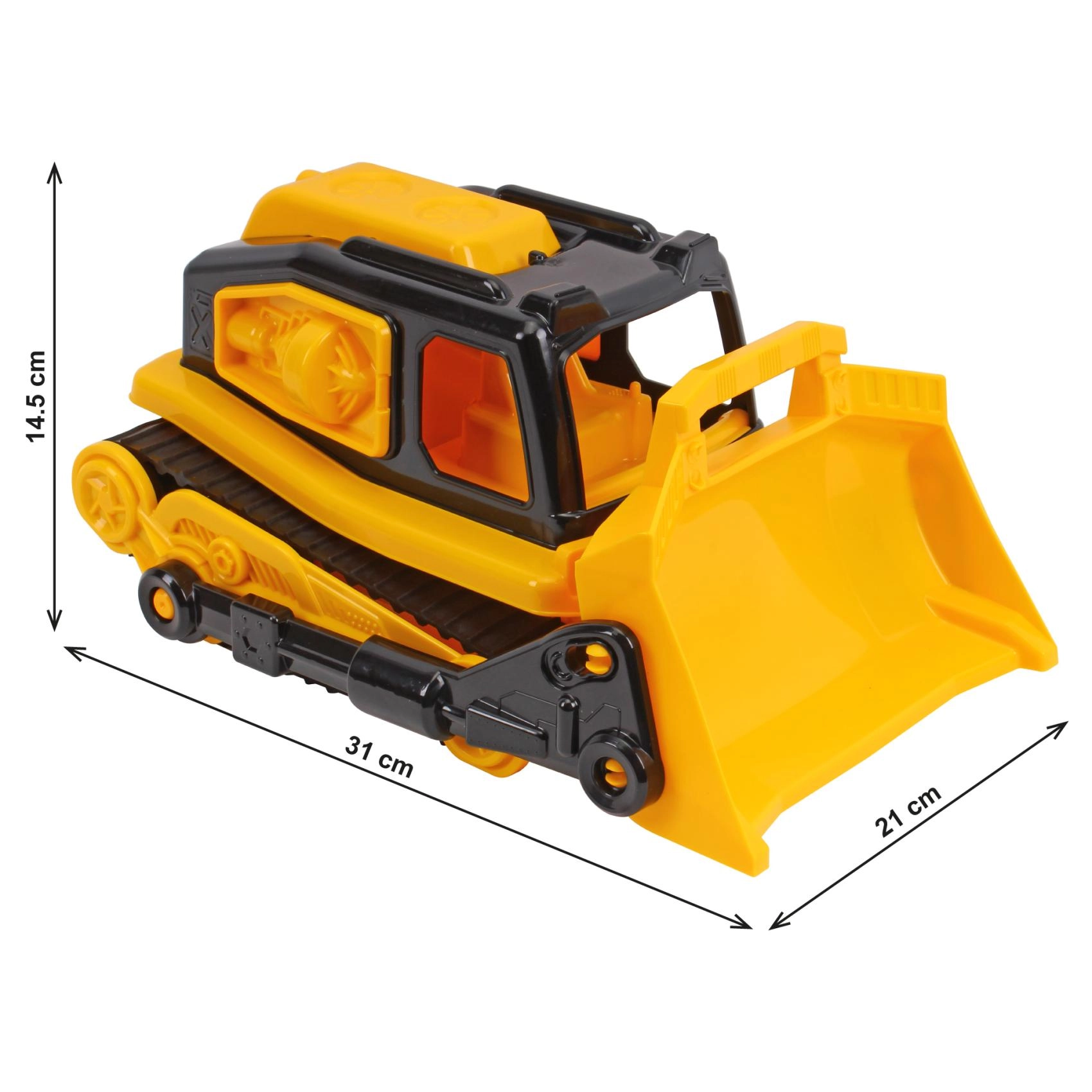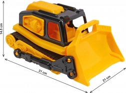 Buldozér je ľahký, no pritom robustný, a preto sa hodí na ihrisko a pieskovisko aj na vnútornú hru. Voľnobeh umožňuje hladké posúvanie, zatiaľ čo pásy dodávajú hračke realistický vzhľad a stabilitu pri jazde.