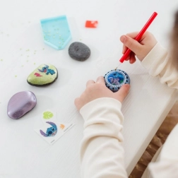 Táto zábavná kreatívna sada sa postará o hodiny tvorenia. Vďaka prepisovacím samolepkám a cca 400 ks dekoratívnych kamienkov ľahko vytvoríte originálne kamienky inšpirované obľúbeným motívom Stitch. Keď sa minú kamene z balenia, môžete pokračovať s úlovkami z prírody.