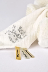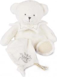 Medvedík je vybavený dečkou, ktorú možno ľahko skryť do jeho bruška, čo je veľmi praktické pri cestovaní alebo ukladaní. Doudou zdobí jemná výšivka a saténové stuhy s francúzskymi nápismi, ktoré pridávajú na jemnosti každému maznaniu.