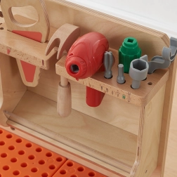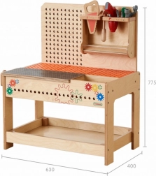 Drevený pracovný stôl s perforovanou doskou a náradím umožní deťom skrutkovať, píliť aj montovať. Učenie a hra v jednom bezpečnom sete.