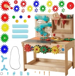 Dielenský stolík je vyrobený z kvalitného dreva a má pracovnú plochu s otvormi na neobmedzené kombinovanie. Deti môžu skrutkovať, spájať, reťaziť ozubené kolá a roztočiť ich kľukou, viesť guličky priehľadnými dráhami a stavať pohyblivé konštrukcie s remeňmi a reťazou. Lakovaný povrch zabezpečuje odolnosť voči UV žiareniu, škvrnám a poškrabaniu.
