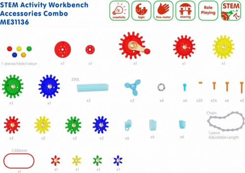 Set obsahuje bohatú sadu ozubených kolies, reťaz s nastaviteľnou dĺžkou, remen na tvorbu pohyblivých konštrukcií, kladky, skrutky, matice a náradie vrátane vŕtačky, skrutkovača, píly a kladiva. Vďaka kompatibilite s ďalšími STEM doplnkami MASTERKIDZ možno pracovnú stanicu jednoducho rozširovať.