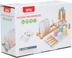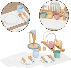 S touto drevenou sadou riadu si deti môžu hrať na domácnosť, reštauráciu alebo organizovanie čajových posedov s priateľmi. Každý prvok je starostlivo vyrobený z kvalitného, bezpečného a odolného dreva, ktoré vydrží aj intenzívne používanie. Nechýbajú taniere, misky, šálky, lyžičky, vidličky, servítky, ochucovadlá a stojan na riad.