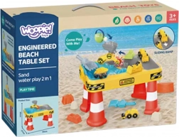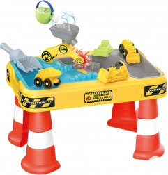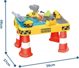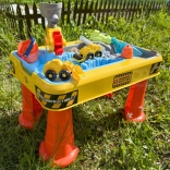 Veľký stolový set s motívom stavby prináša deťom hodiny zmyslovej a kreatívnej hry. Dvojitá komora umožňuje samostatne naplniť časť vodou a časť pieskom, takže malí stavitelia si môžu vyskúšať bagrovanie, sypanie, liatie aj riadenie vozidiel. Vďaka stabilným „kužeľovým“ nohám je stôl pevný a bezpečný na vonkajšie aj vnútorné použitie.