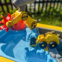 Súčasťou sú 4 mini stavebné autíčka (bager, domiešavač, sklápač, buldozér), otočný žeriav, zjazd pre vozidlá, vodné rampy a koleso aj praktické doplnky pre piesok a vodu (krhla, lopatka, hrable, formičky). Jednoduchá konštrukcia zaistí rýchlu montáž bez náradia a jednoduché čistenie po hre.