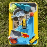 Široké nohy zabezpečujú stabilitu, zatiaľ čo set 12 dielov zahŕňa 4 stavebné autíčka a nástroje: krhlu, lopatku, hrable a formičky.